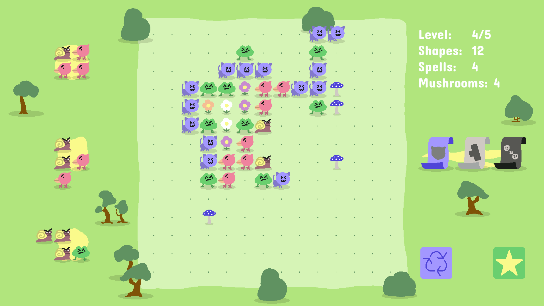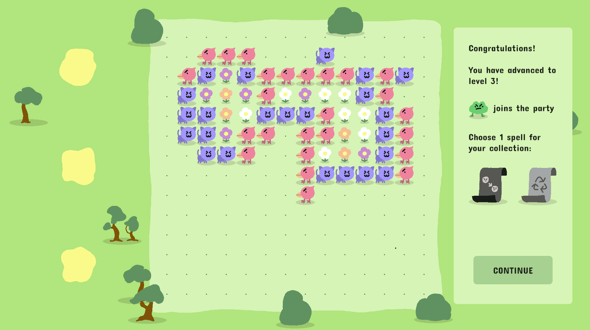 Angry Flower Farmers is a grid-based puzzle-roguelike game where you drag tetromino-style animal shapes to form closed loops and grow flowers.